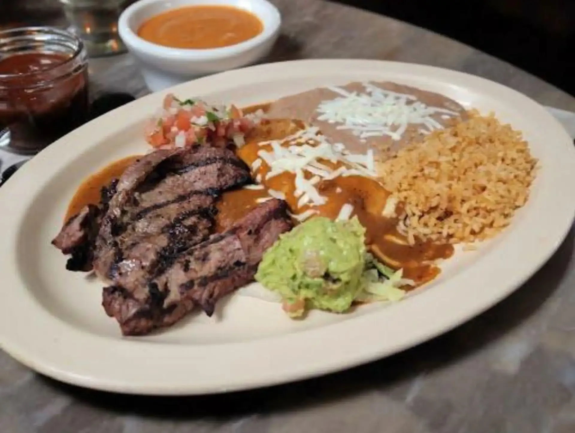 Grilled steak served with a cheese enchilada, rice, beans, guacamole, and pico de gallo.