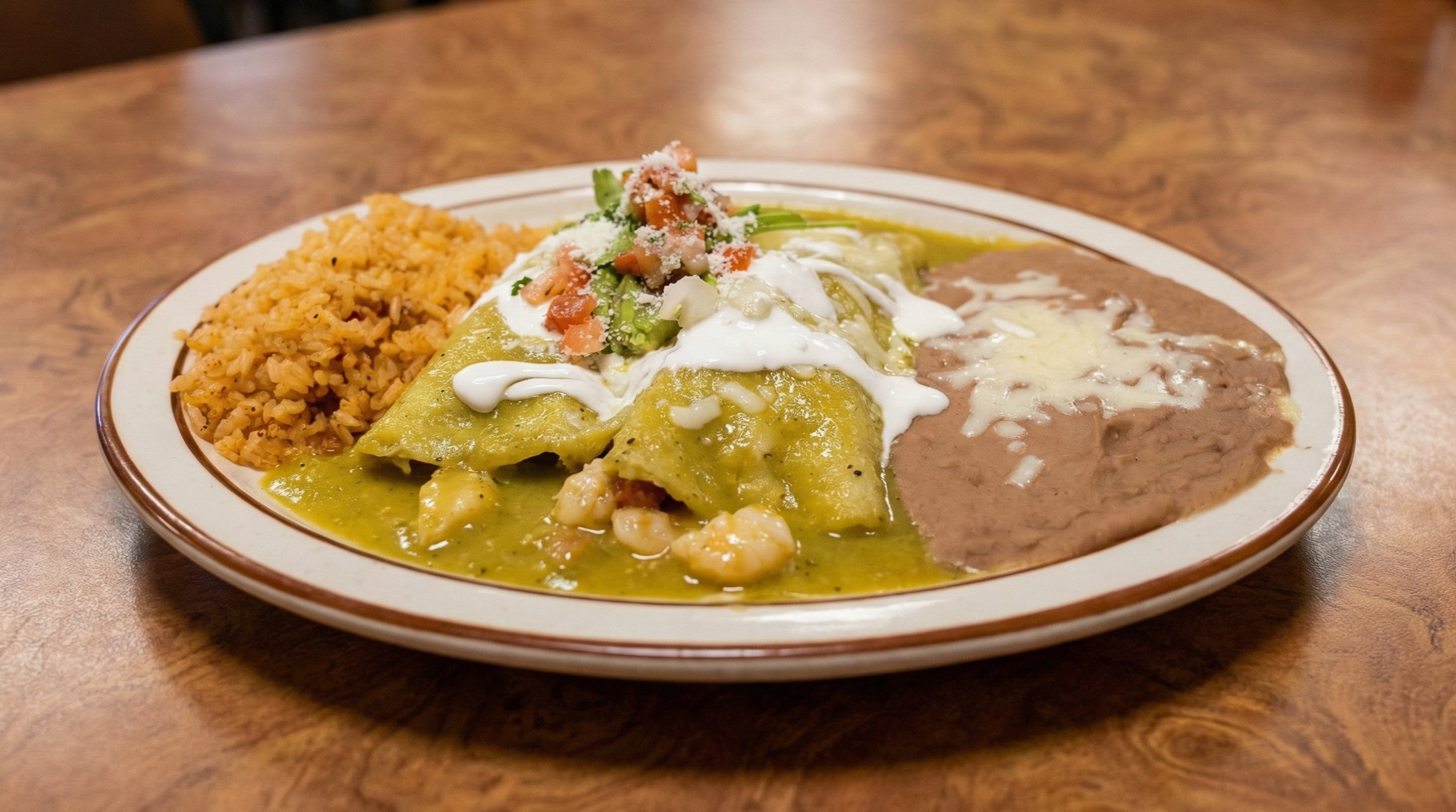 Enchiladas filled with shrimp, served with rice, beans, sour cream, and avocado.