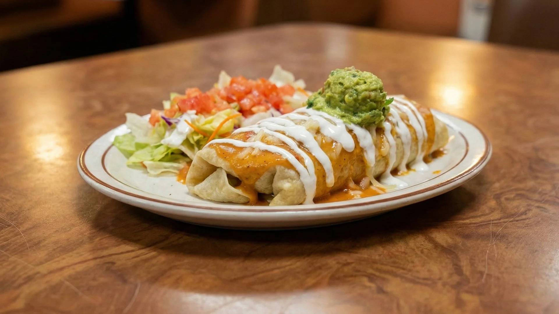 Large burrito filled with carne asada, grilled chicken, carnitas, or chile relleno, plus rice and beans. Topped with melted cheese, Spanish sauce, sour cream, guacamole, and salad.