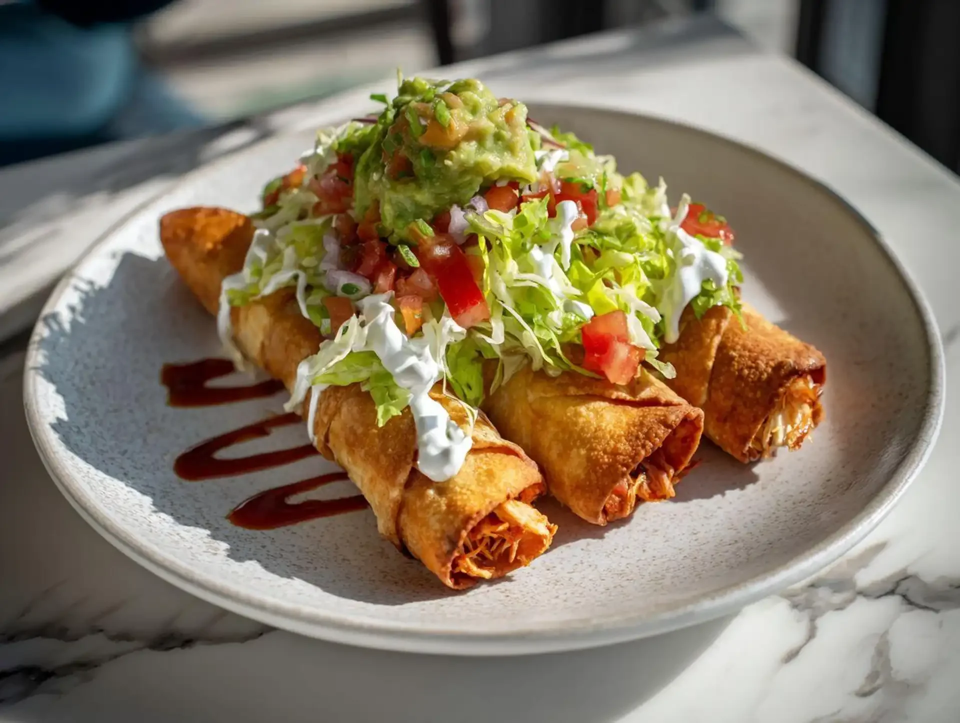 Crispy fried corn tortillas filled with shredded chicken, topped with lettuce, guacamole, salsa fresca, and sour cream.